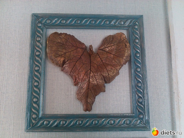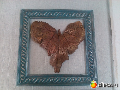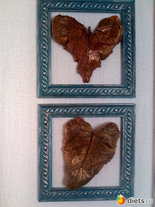 Отливочки листьев из гипса. Кабачок и лопух. Оформила их в рамочки из покрашенного потолочного плинтуса.