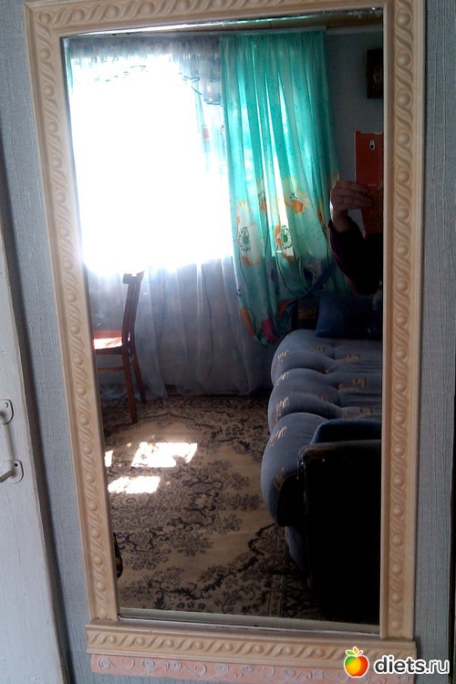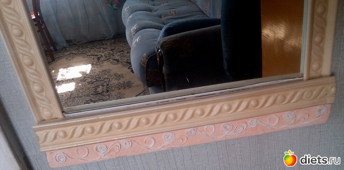 Ещё наконец-то руки дошли до зеркала. Лежало много лет без дела зеркальное полотно, и я его наконец благополучно пристроила. Рама- потолочный плинтус. Внизу - аппликация из скрученных жгутиков.