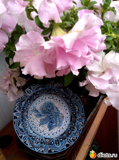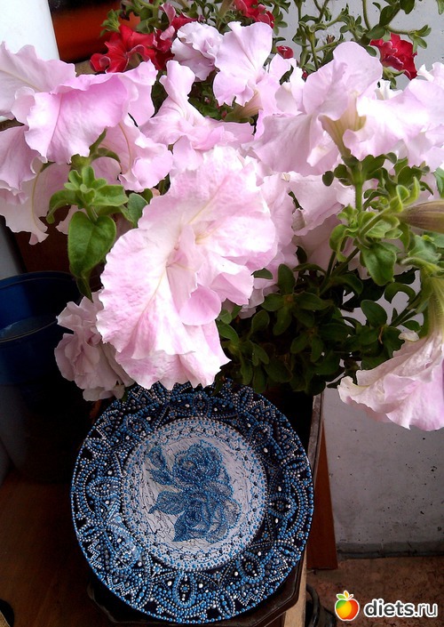 И напоследок петуньи и тарелочка: декупаж плюс точки: