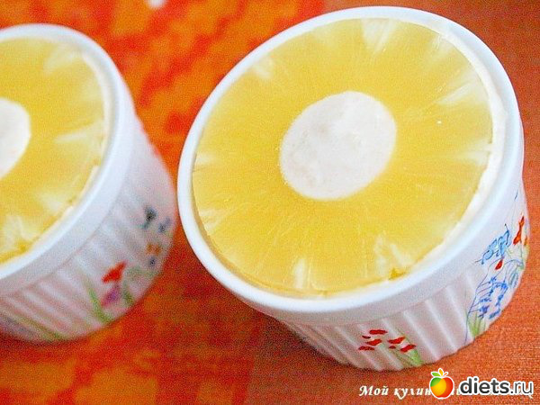 6. Разложить полученную массу в формочки, разровнять поверхность. В каждую формочку положить сверху по кружку ананаса. Плотно накрыть концами фольги и поставить в холодильник на 2–3 ч. Перед подачей к столу вынуть суфле из формочек, потянув за свободные концы фольги, выложить на порционные тарелки.