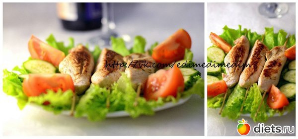 После истечения времени насадить мясо на шпажки, разогреть сковороду с антипригарным покрытием, выложить туда грудки и зарумянить на среднем огне, перевернуть (никакого масла не лить! так полезнее)).