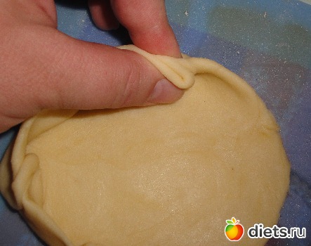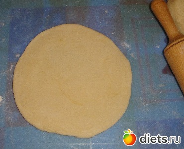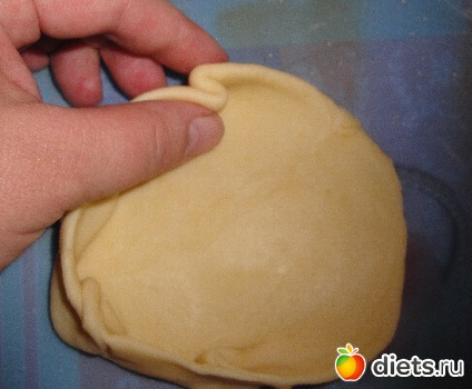 Достаем из холодильника тесто, отделяем кусочек размером с яйцо и раскатываем из него круг размером 13-14см. Сочень НЕ должен получиться очень тонким, при выпечке тесто не будет увеличиваться.