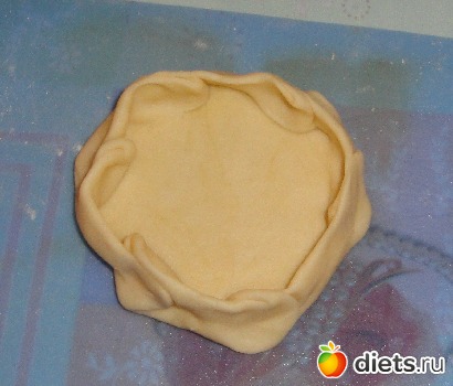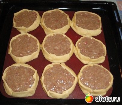 Получившиеся "корзиночки" выкладываем на противень и наливаем внутрь начинку: