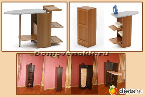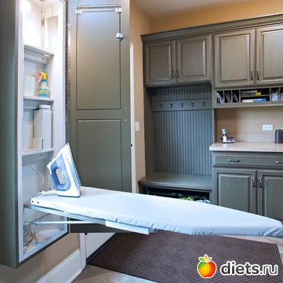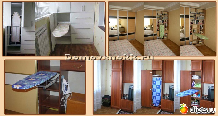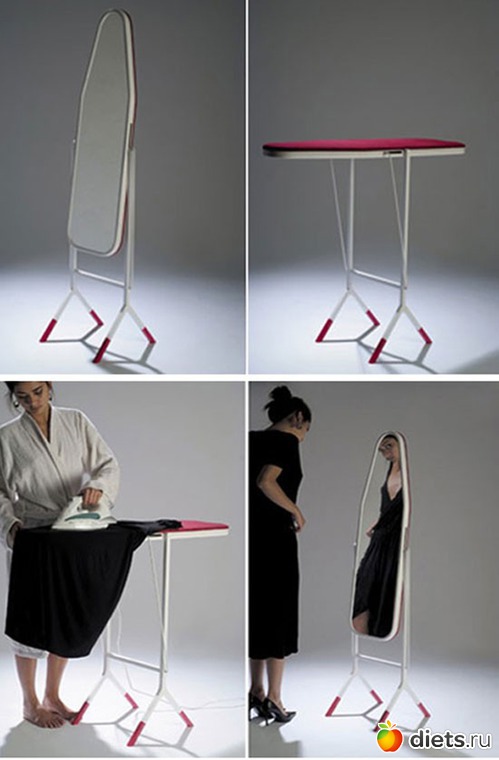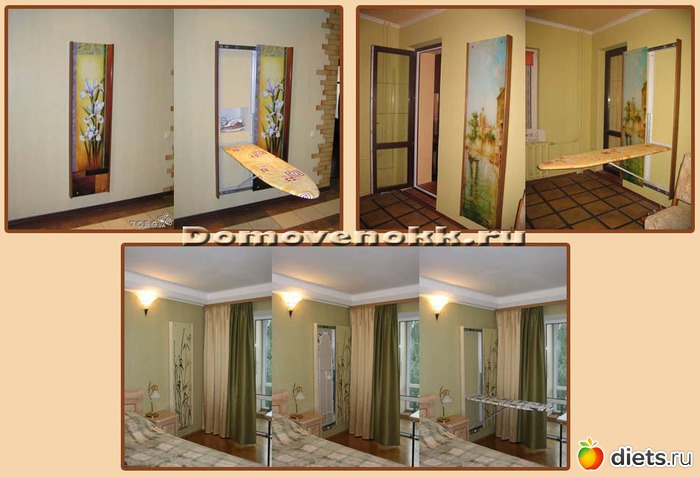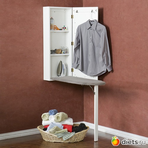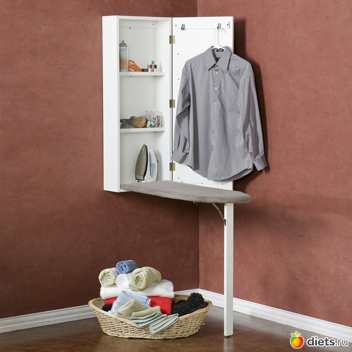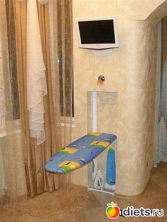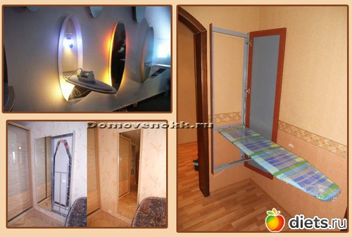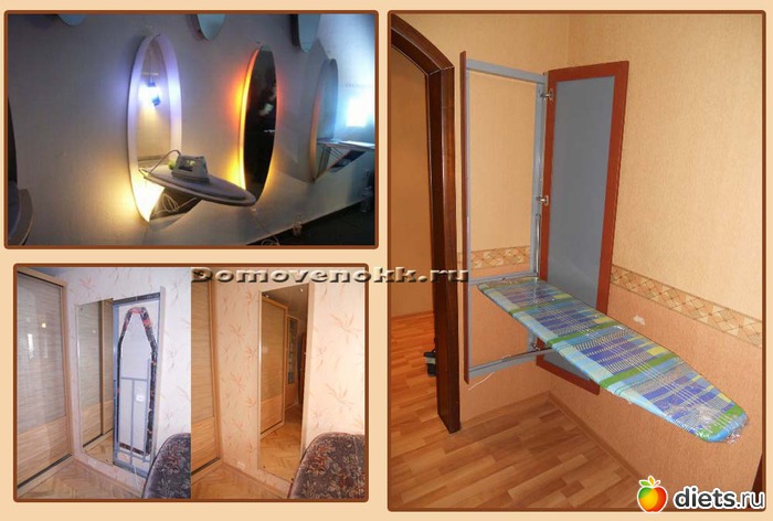 Или гладильная доска прячется за зеркалом в небольшой шкафчик.