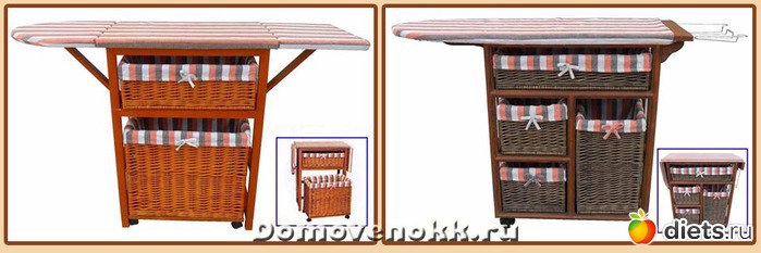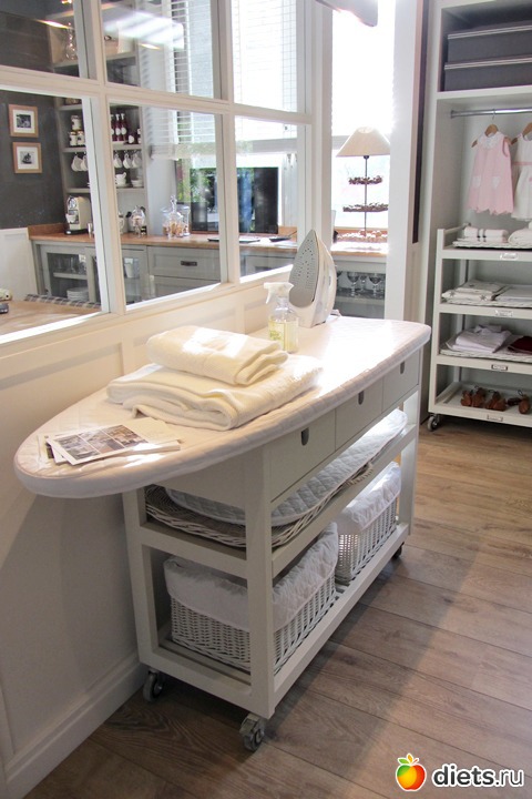 А можно и не прятать гладильную доску. Ну, почти. Можно ее трансформировать. Уютный комодик с милыми корзинками на самом деле гладильная доска с местом и для утюга, и для белья.