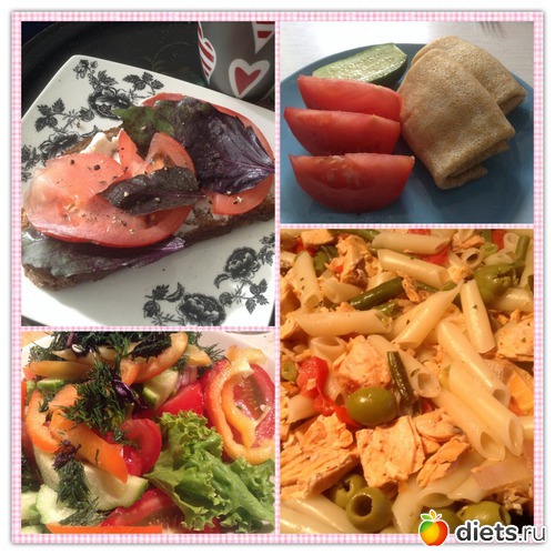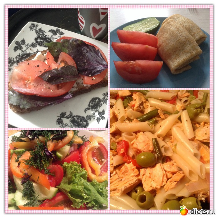 На завтрак - бутерброд с брынзой и помидорами, на обед - блинчики с мясом и огурцом-помидором, на ужин - паста с лососем и зеленой фасолью и салат. Ну еще арбуз в перерывах,,,