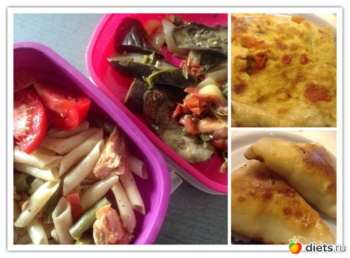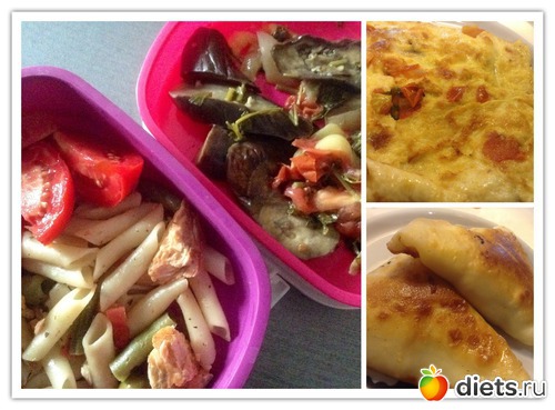 На обед у меня была та самая паста с лососем и соте из баклажанов с помидором. Яблоко еще было, за кадром.