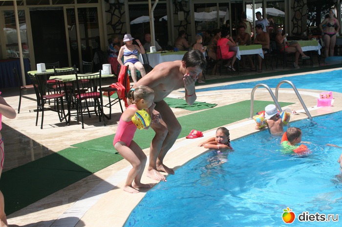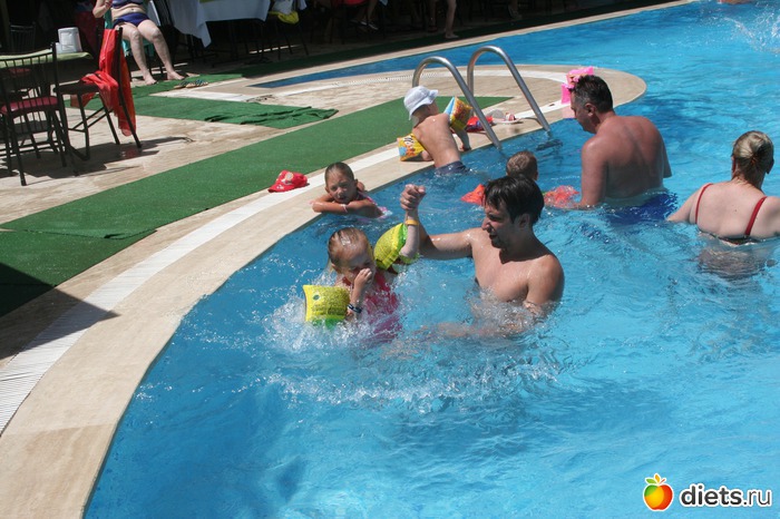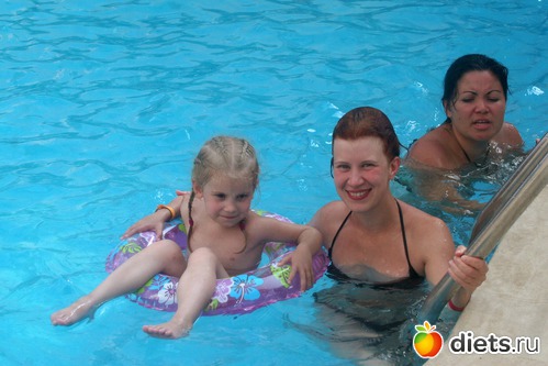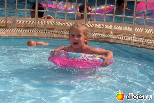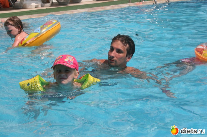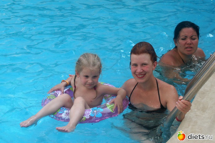 Отдельная наша радость - это дочка. Приехали мы на отдых с страхом воды. Она в бассейн 30см глубиной еле решалась встать, не то чтобы сесть или лечь.