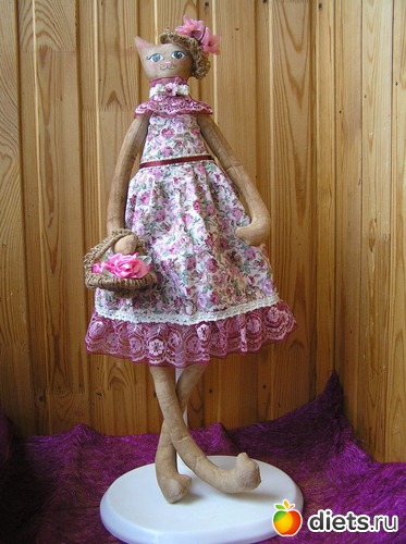 Красавица кошечка, высотой 60см. сшита из бязи, напотнитель синтепон. Одежда из коттона, украшена тесьмой из льна и атласными лентами, кружевом. Шляпка и корзиночка, связаны крючком, цветы из капроновых и атласных лент. Мордочка расписана акриловыми красками для ткани. Одежда съемная(можно постирать). Характер покладистый, может часами слушать собеседника.https://www.diets.ru/board/view/150659/ Читать полностью