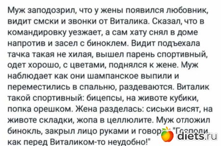 Вчера прочитала комментарий: - Если бы мой муж сказал, что я толстая, я бы с ним не три дня не разговаривала, а убила бы! С какой радости? Только потому, что неудобная ПРАВДА ранит? Давайте уже как-то по справедливости: - да, женщина может быть любой, - да, мужчина имеет право говорить правду и не хотеть жирное тело. Что вы прикажете делать моему товарищу? Пить виагру? Страдать всю жизнь?