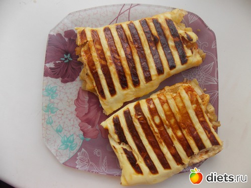 Затем сверху кладём фарш: всё что вам нравится... У меня перетёртые томаты, ветчина, орегано, моцарелла и сверху слой тертого сыра. Опять запекаем 7-10 минут и готово! Выглядит как пицца. Я ещё посыпала листьями салата и свернула в рулет. Попробуйте, надеюсь понравится