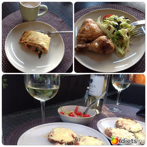 с бутылочкой белого вина, салат и запечённый белковый хлеб ( это типо пиццы у нас) всё Low Carb, ни чего лишнего.