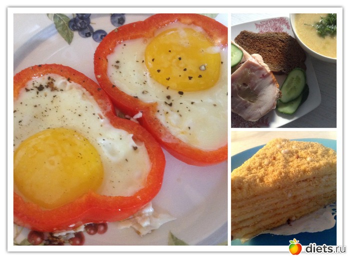 На завтрак сделала яичницу в перце (муж отъел половину). На обед был суп-пюре и сандвич с "фазаном с ананасом".