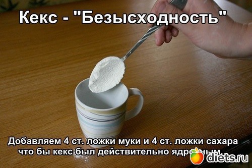 Кекс "Безысходность")))) Наткнулась недавно на вот такой рецептик кекса. Банально захотелось сладкого-шоколадного. Кекс печётся в микроволновке, 3 минуты, просто сказка. Делала половину порции, получилась полная кружка шоколадного шикарного кекса. На завтрак может позволить себе даже худеющая барышня, коей я и являюсь. Правда сливочное масло было лишним, в следующие разы я его уже не добавляла.