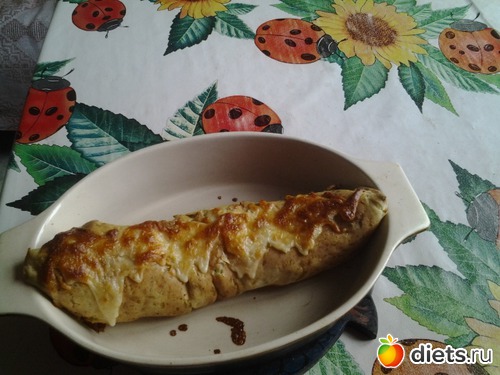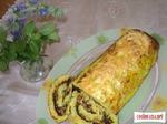На выпеченный пласт выложить начинку, сверху посыпать натертым сыром, свернуть рулетом. Рулет выложить на противень, сверху смазать майонезом и посыпать сыром, поставить в духовку на 10-15мин, чтобы зарумянился сыр.