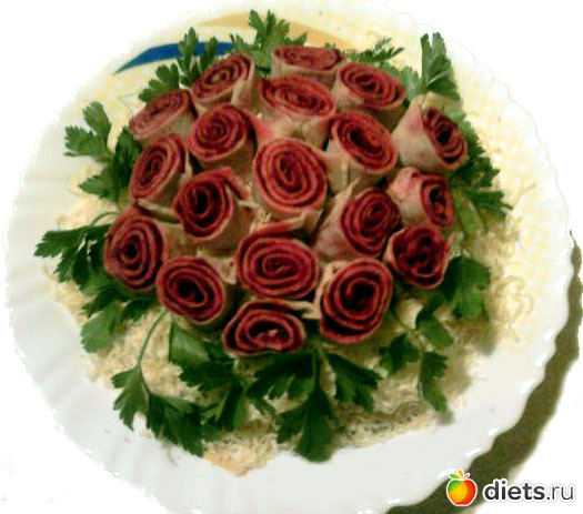 Пожарить 2 блинчика, смешиваем тертые на мелкой терке отварную свеклу и чесночок, заправляем 2-3 стол. ложками майонеза. Намазываем хорошенько каждый блинчик свекольной смесью, сворачиваем, нарезаем небольшими кусочками (толщиной где-то 1,5см), в центре выкладываем наши розочки, а по кругу обильно украшаем зеленью.