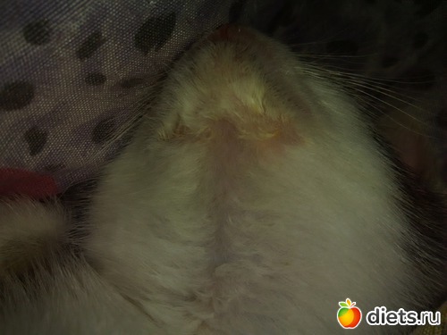 Месяц назад подобрали котёнка. Малюсенького, истощенного. Маленький и худенький был настолько, что ветеринар не взялся определить возраст. 2 недели сидел в карантине. Ничего кроме запоров не выявили, но и с ними справились. Котеночек растёт, активный. Играет с большим котом. Но 5 дней назад на подбородке обнаружила засысинку. Ни покраснений, ни чашуек, ни прыщиков.