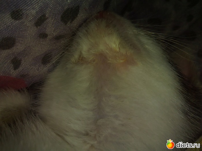 Месяц назад подобрали котёнка. Малюсенького, истощенного. Маленький и худенький был настолько, что ветеринар не взялся определить возраст. 2 недели сидел в карантине. Ничего кроме запоров не выявили, но и с ними справились. Котеночек растёт, активный. Играет с большим котом. Но 5 дней назад на подбородке обнаружила засысинку. Ни покраснений, ни чашуек, ни прыщиков.