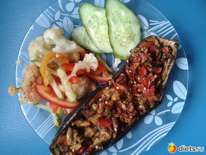Баклажаны фаршированные овощами с салатом из цветной капусты.