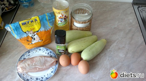 Добавить к филе порезанные кабачки, соль, перец, чеснок. Перемешать