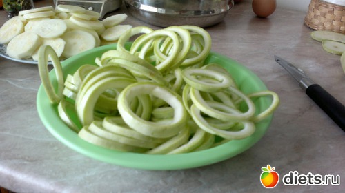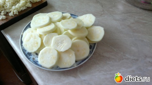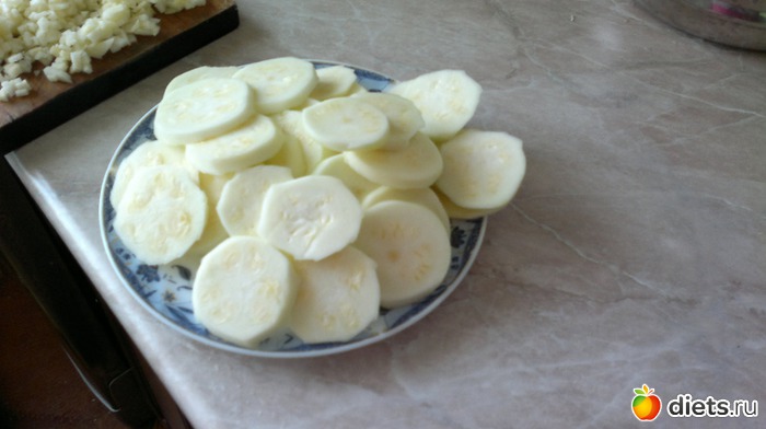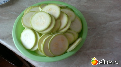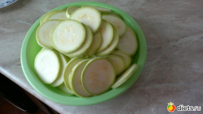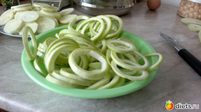 Кабачки нарезать как можно тоньше, примерно 3-4 мм