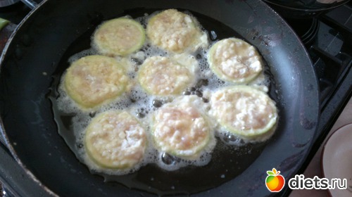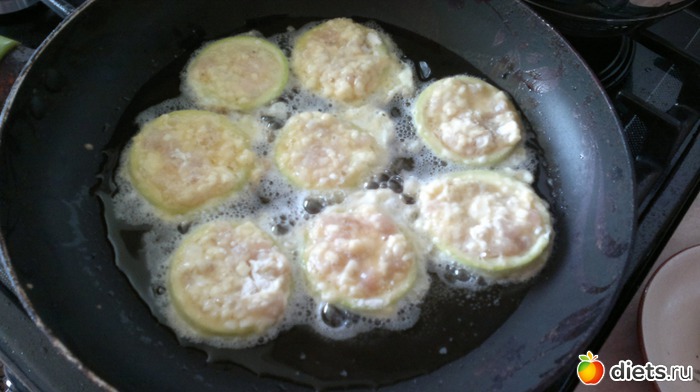 Обваливаем сначала в муке а потом в яйце. Это момент я забыла сфоткать. И выкладываем на сковороду с раскаленным маслом. Обжаривается конечно быстро, но я когда перевернула, накрыла крышкой чтобы кабачки стали мягкими.