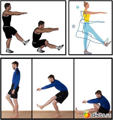 3. Приседания. Разминка: 30 глубоких приседаний, ноги на ширине плеч, 30 глубоких приседаний, ноги вместе.