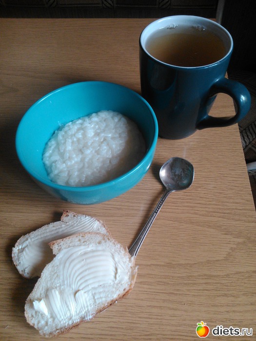 Завтрак - рисовая каша, 2 бутерброда с сыром, зеленый чай...
