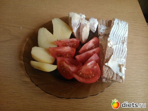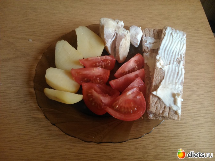 Перекус - куриная грудка, помидор, 2 маленькие вареные картофелины, 2 хлебца с сыром...