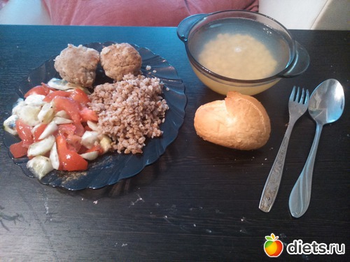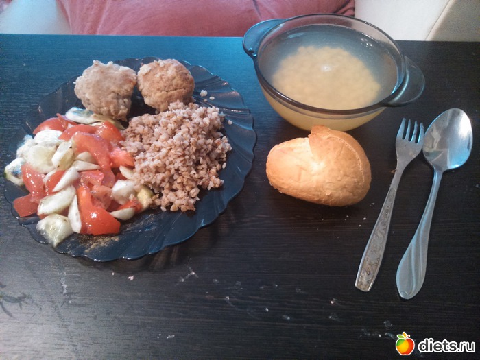 Обед - куриный бульон с кукурузой, немного хлеба, гречка, 2 котлетки, салат из помидор, огурцов заправила маслом...