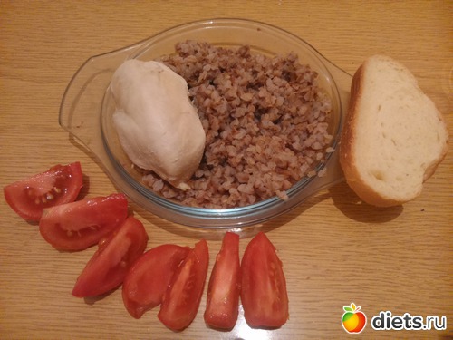 Ужин - немного гречки, куриная грудка, помидор, ломтик хлеба..