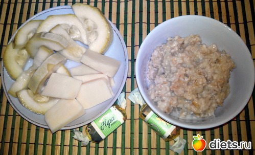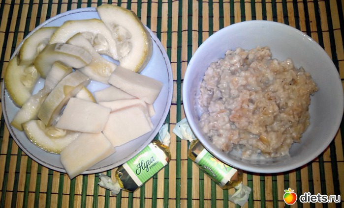 Маринованные кабачки, геркулес, немного сыра и две конфеты.