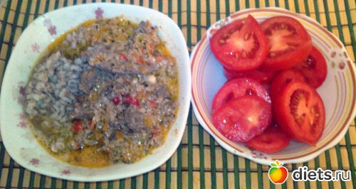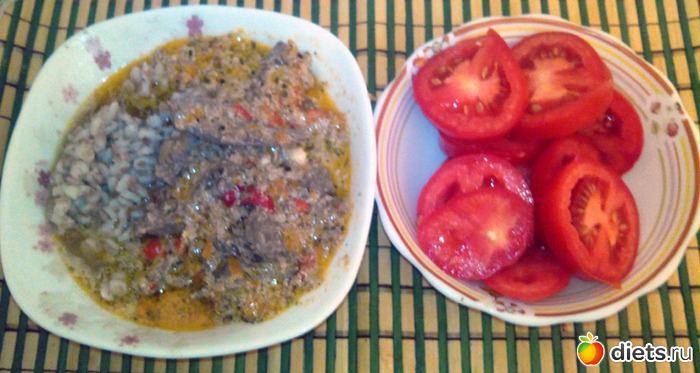 Пара помидорок и перловка с тушеной печенью.