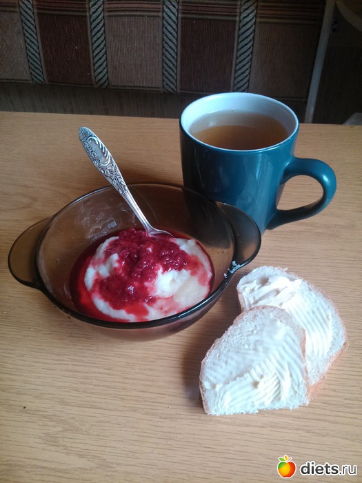 Завтрак - манная каша с малиновым вареньем, чай, 2 бутерброда с сыром...