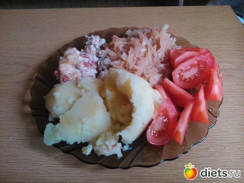 Обед - пюре, тушеная капуста, куриная грудка тушеная, помидор...