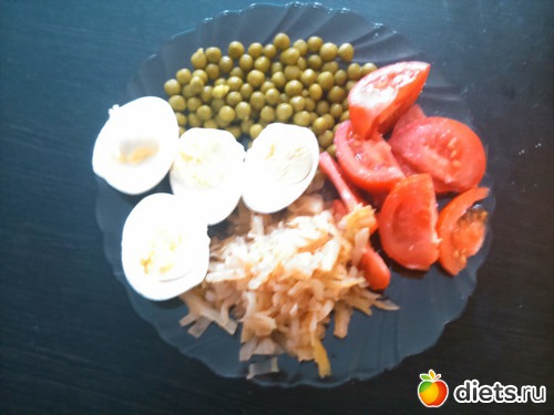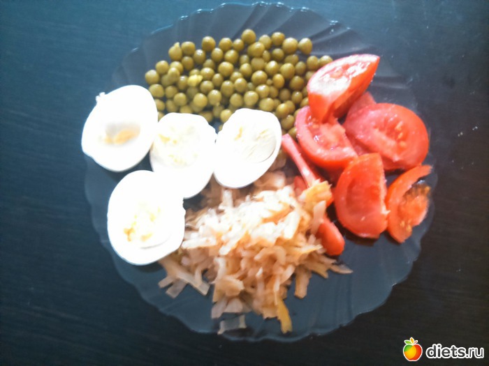 Обед - зеленый горошек, помидор, капуста тушеная (наконец-то я ее съела), 2 яйца...