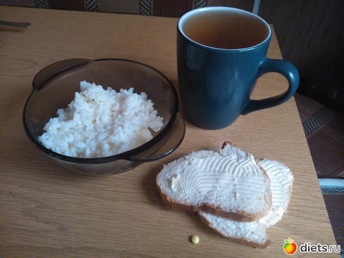 Завтрак - рисовая каша, 2 бутерброда с сыром, зеленый чай...
