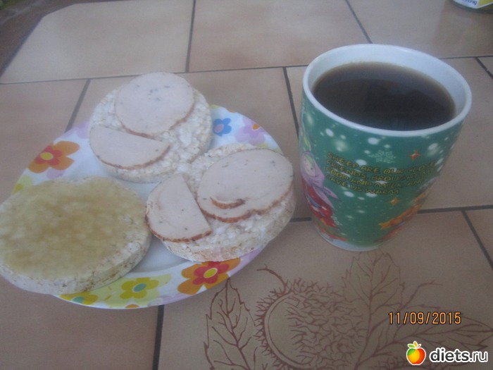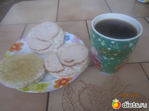 1. кофе, 2 бутерброда из рисовых хлебцов и куриной ветчины, 1 хлебец с медом