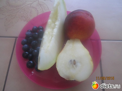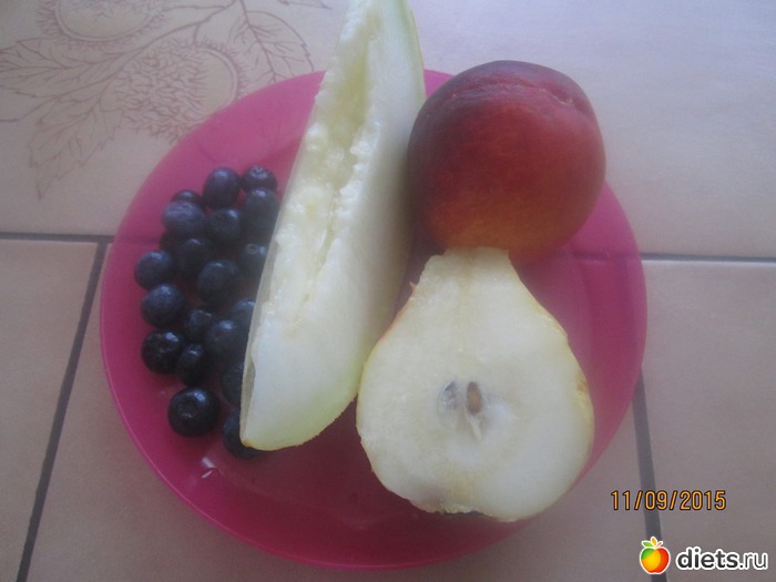 2. фрукты (пол груши, кусочек дыни, 1 персик, немного черники)
