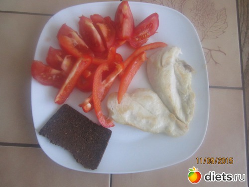 3. 150 грамм жаренной курицы (грудка), помидор, сладкий перец, полкусочка черного хлеба