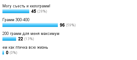 Добрый день! Вот читаю я на диетсе посты многих людей, планы питания с фотками и думаю: все так по-разному питаются в плане количества. Вот те, кто ест 2 сттоловых ложки вареной гречки и один маленький помидор(это я к примеру), этим действительно можно наесться? Конечно я не сторонник обжираловки, но такого количества мне было бы мало. В зависимости от питательности еды, я могу и полкило её за раз умять, ну допустим, если это большое яблоко или груша(грамм 300 затягивает) + мясо+салат. Мне вот что интересно:действительно, если приучить себя есть мало, всю жизнь смогу по 150 грамм еды есть и не чувствовать постоянного голода? Есть те, кто наедается 150-200 грамм еды? Я говорю о нормальной еде, а не о 200 грамм шоколада или торта. Например съесть 100 грамм мяса+ 100 грамм салата и всё.