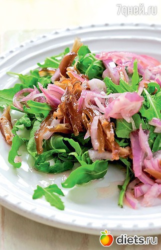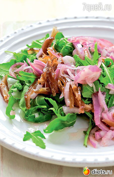 Выложить на блюдо рукколу, затем финики с луком вместе с маринадом и посыпать все зеленым луком.