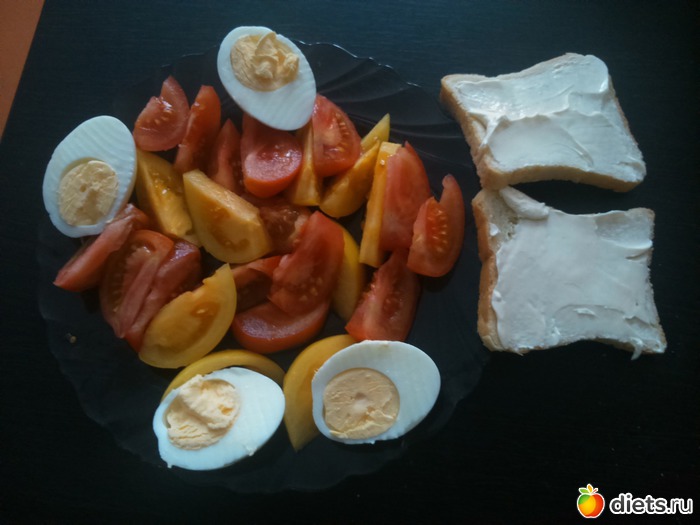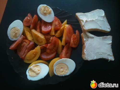 Обед - 2 помидора, 2 яйца, 2 бутерброда с сыром, долька шоколада...