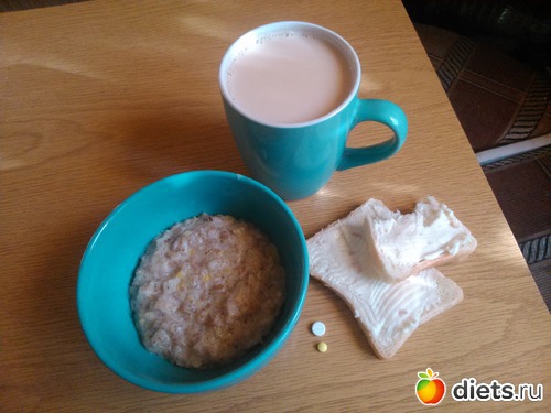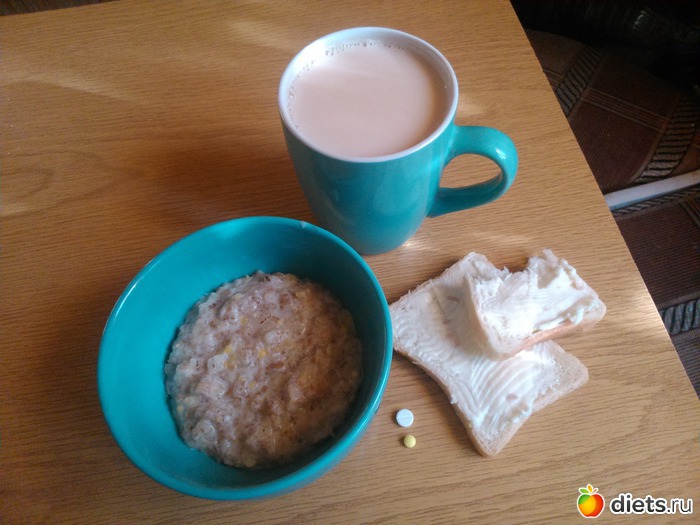 Завтрак - каша 5 злаков, 1,5 бутерброда с сыром, чай с молоком без сахара...