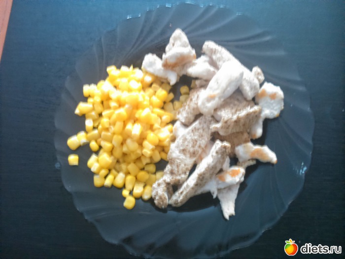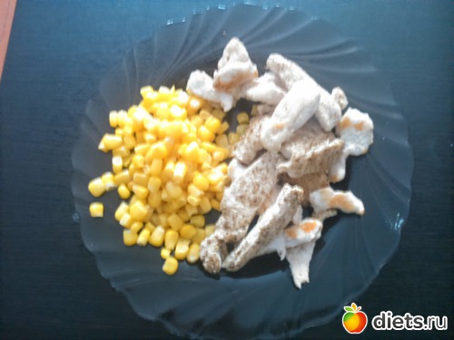 Обед - кукуруза, обжаренная на сухой сковороде куриная грудка с черным перцем и немного соли...