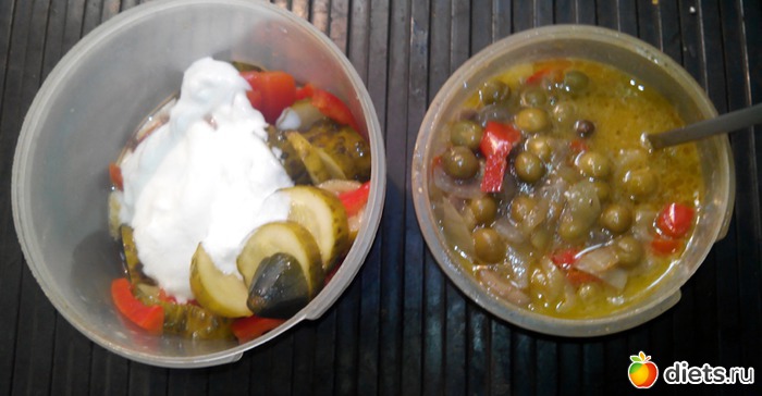 Остатки мяса. По ним видно, что в мясе этом горошка гораздо больше чем мяса. Нечто вроде салата из маринованного огурца и перца. Кстати, очень интересное сочетание вкусов. А сверху йогурт.