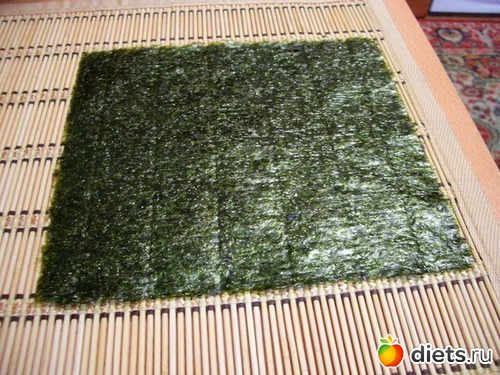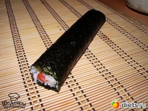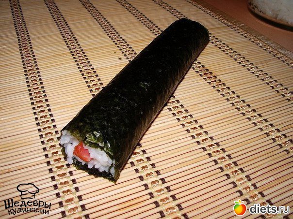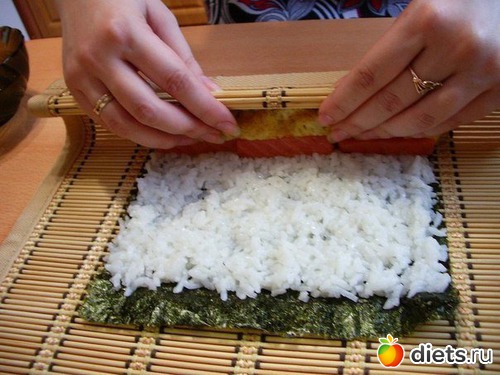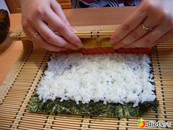 Рекомендуют добавлять сыр Филадельфия, но мы готовились к приготовлению спонтанно и не нашли его в продаже. Когда начинка уложена, заверните край коврика так, чтобы он коснулся краем риса. Приподнимая коврик, скрутите нори в тугой рулет.
