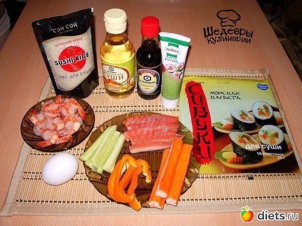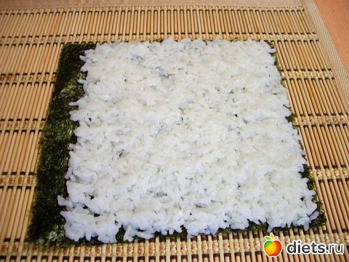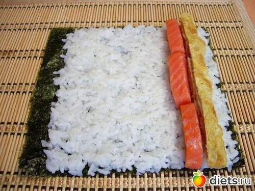 Для роллов Сёгун (форель+омлет) омлет можно еще тепленьким свернуть в рулетикОгурец, перец, рыбку порезать брусочками (на фото выше уже все порезанное). Креветки отварить (закинуть в кипящую воду, после закипания варить 1-5 минут, зависит от размера). Это был подготовительный этап. Теперь непосредственно скручивание роллов. Для этого необходим бамбуковый коврик. На коврик положить лист водоросли блестящей стороной вниз. На водоросли - разложить рис, у верхней границы оставить 1,5 см свободным. Чтобы рис не прилипал к рукам, смачивайте руки в смеси холодной воды и рисового уксуса (200 мл воды + 3 ст.ложки уксуса).
