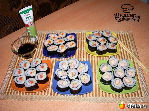 Край водоросли без риса смочите водой и он очень хорошо прилипнет к рулетику. Я выкладывала рис тепленьким. От этого водоросли становились мягкими и скручивались замечательно, коврик почти не понадобился, только для первого "толчка". Дав полежать несколько минут, я разрезала рулетики на кусочки в 1,5 см, для удобства поедания. При разрезании, чтобы рис не прилипал к ножу, смачивайте его в смеси воды и рисового уксуса. Подаются суши - роллы с соевым соусом, васаби - японским хреном и маринованым имбирем.