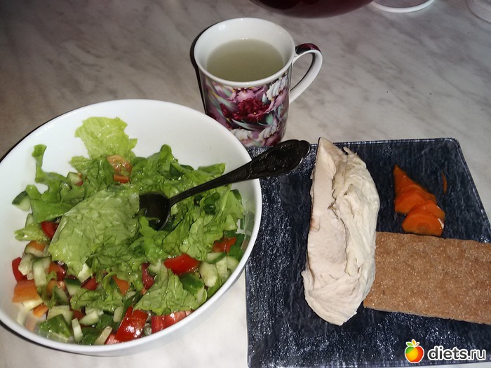 Отварная кур.грудка, овощной салат(салат листовой, огурец, помидор, перец, ложка масла растит.), ржаной хлебец и чашка бульона.